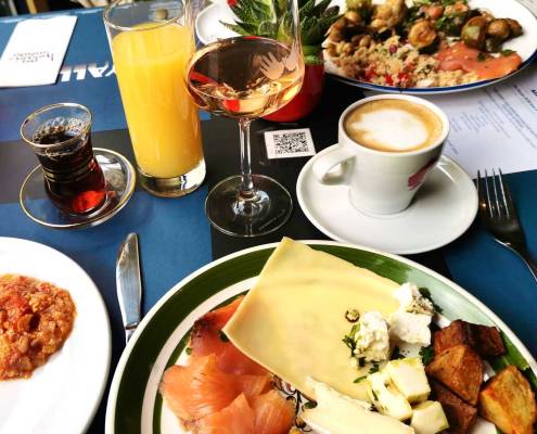 Unser reichhaltiges Frühstücksbuffet vereint das Beste aus verschiedenen Küchen der Welt. Von traditionellen österreichischen Frühstücksspezialitäten bis hin zu orientalischen Köstlichkeiten – bei uns findest du deine persönlichen Favoriten. Genieße unlimitierte Heißgetränke wie verschiedene Kaffeespezialitäten und ausgewählte Teesorten, die in unserem Brunch-Preis bereits inkludiert sind.